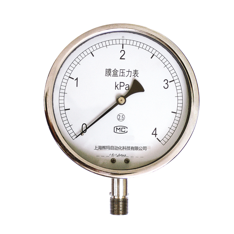 不锈钢膜盒压力表根据普通膜盒压力表的结构原理而研制具有耐腐蚀的微压测量仪表。导压系统信外壳均采用不锈钢材料制成。